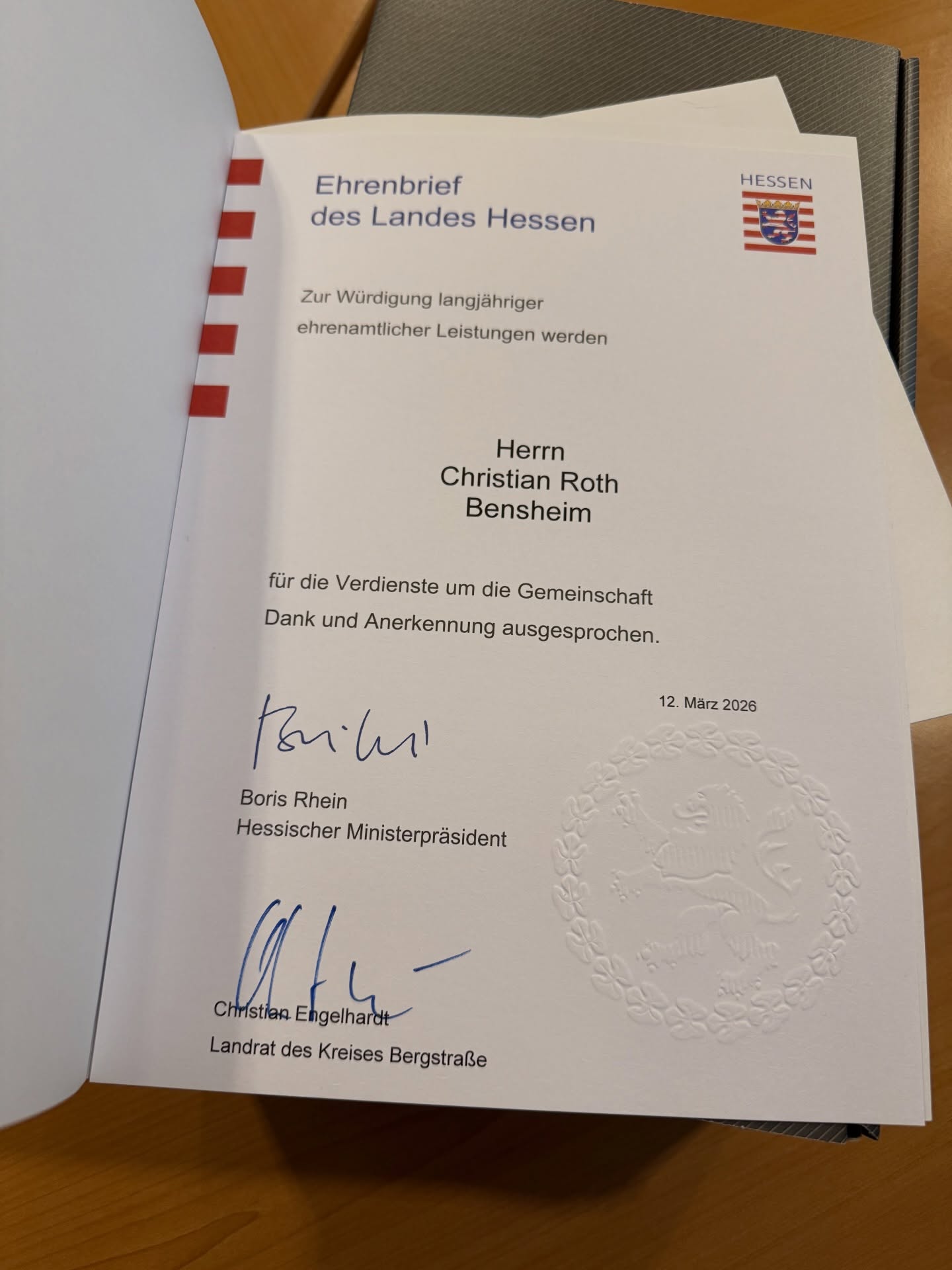 Mit dem Landesehrenbrief wurde er für sein außergewöhnliches Engagement geehrt – eine der höchsten Auszeichnungen des Landes Hessen für ehrenamtlichen Einsatz. Die Auszeichnung wurde gestern im Bensheimer Rathaus von Bürgermeisterin Christine Klein und Landrat Christian Engelhardt überreicht.